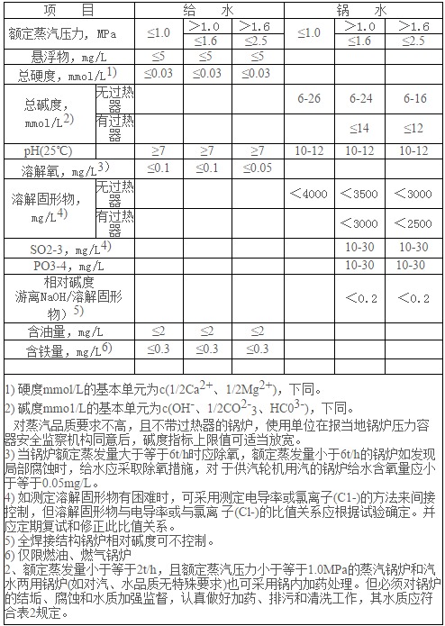 1、蒸汽鍋爐和汽水兩用鍋爐的給水一般應(yīng)采用鍋外化學(xué)水處理,水質(zhì)應(yīng)符合表1規(guī)定