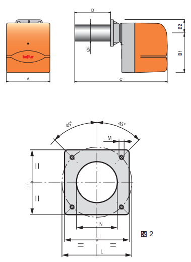 帶有噴嘴和鋼制火焰擴散盤的鋼質可調節燃燒頭。